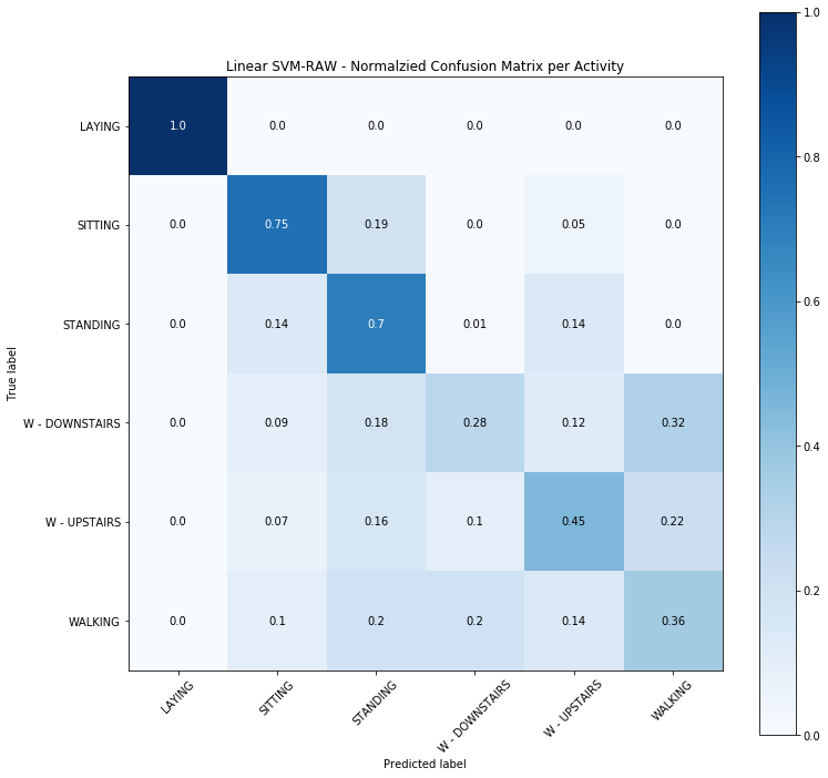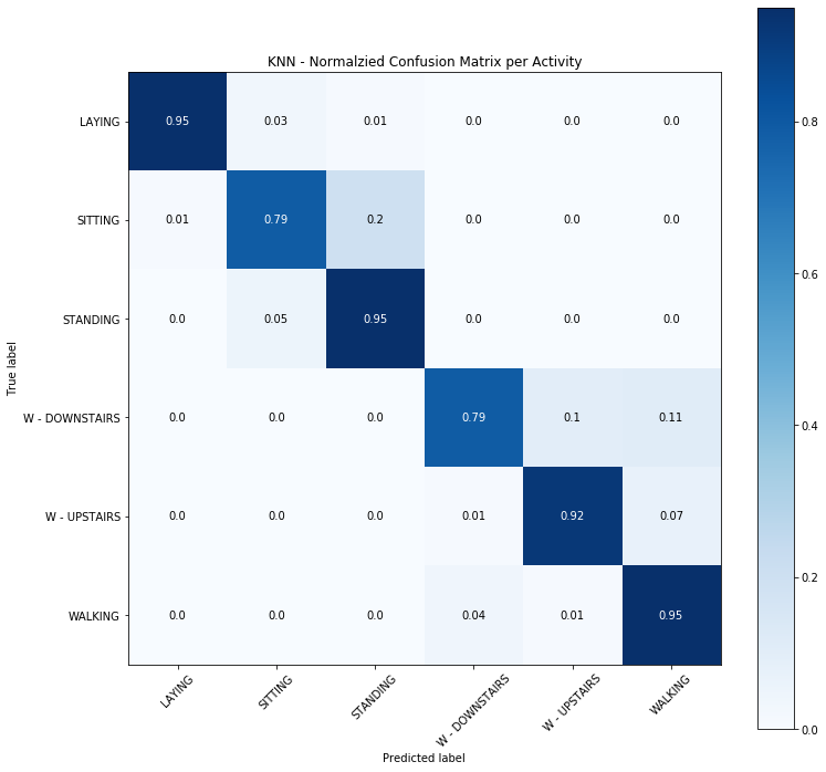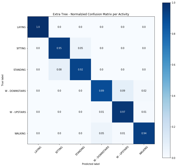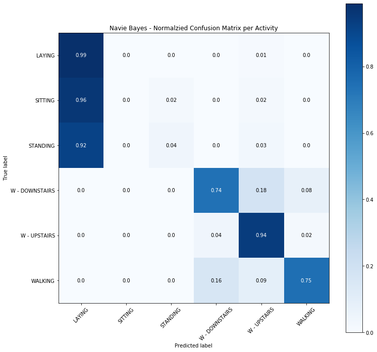 在這些模型當中, 以 Linear SVM 表現在佳, Ensemble 其次。Naive Bayes 由於模型太過簡單而無法正確的區別三種較為靜態的活動 (坐, 躺, 站)(Fig. 6)。